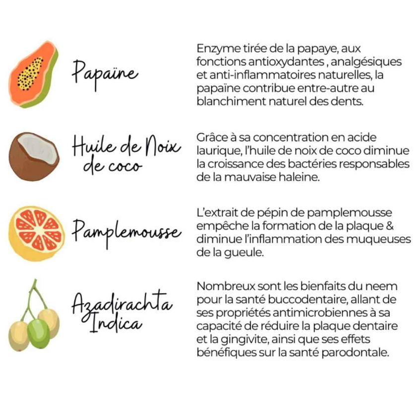 Annexes: Eau, Glycérine, Gomme Xanthane, Bioflavonoïdes d’agrumes, Huile de coco, Azadirachta indica, Dioxyde de silicium, Bicarbonate de sodium.