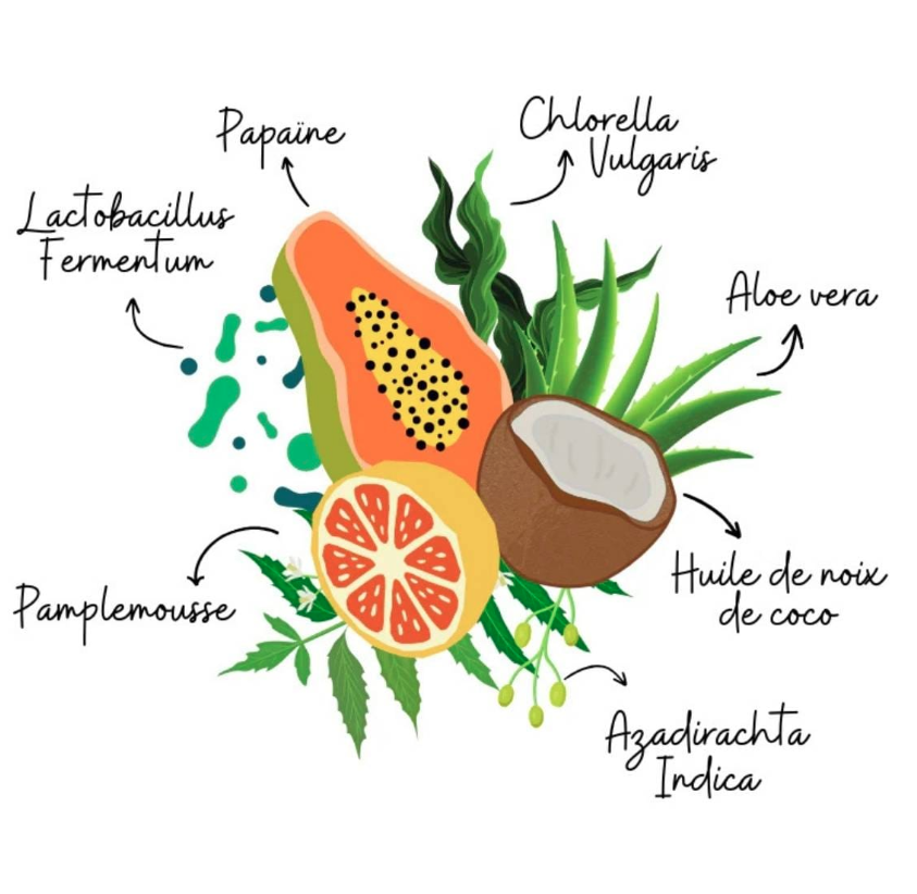 Actifs: Papaïne, Glucose Oxydase, Lactobacillus Fermentum, Gomme d’Acacia, Chlorella Vulgaris, Aloe Vera