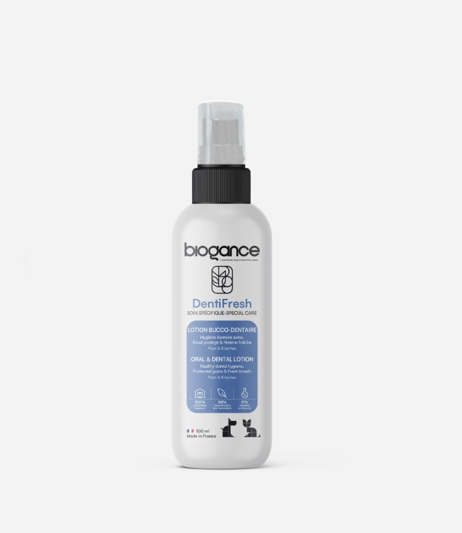 Le soin dentaire Dentifresh pour chien et chat est formulé à base d’enzymes et de fluor. Il empêche la formation du tartre, une hygiène dentaire saine, une haleine fraîche et un émail protégé.