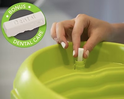– Possibilité d’ajouter des blocs Dental Care qui se dissolvent lentement dans l’eau et libère des substances qui aident à prévenir la formation de la plaque dentaire et le dépôt de tartre pour des gencives plus saines et à combattre la mauvaise haleine. Dental Care contient aussi du calcium pour des dents et des os plus solides.*