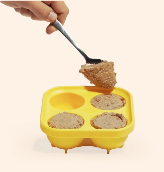 Remplissez-le de la nourriture préférée de votre chien (pâtée, bouillon, yaourt, etc.) et placez-le au congélateur pour obtenir 4 friandises de taille idéale que votre chien adorera !