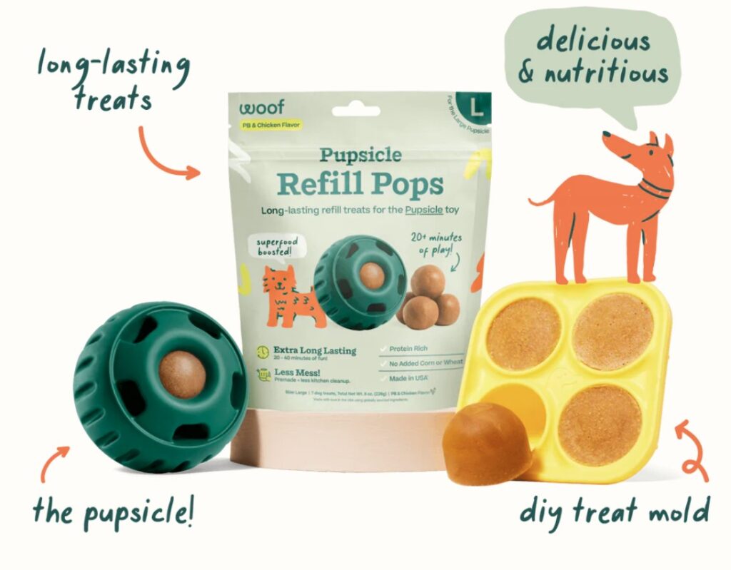 Le Pupsicle s’ouvre au milieu pour faciliter le remplissage, le nettoyage et la réutilisation. Pour commencer, dévissez le fond, glissez une friandise à l’intérieur et donnez là à votre chien.