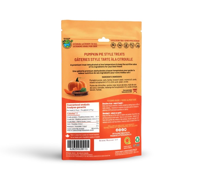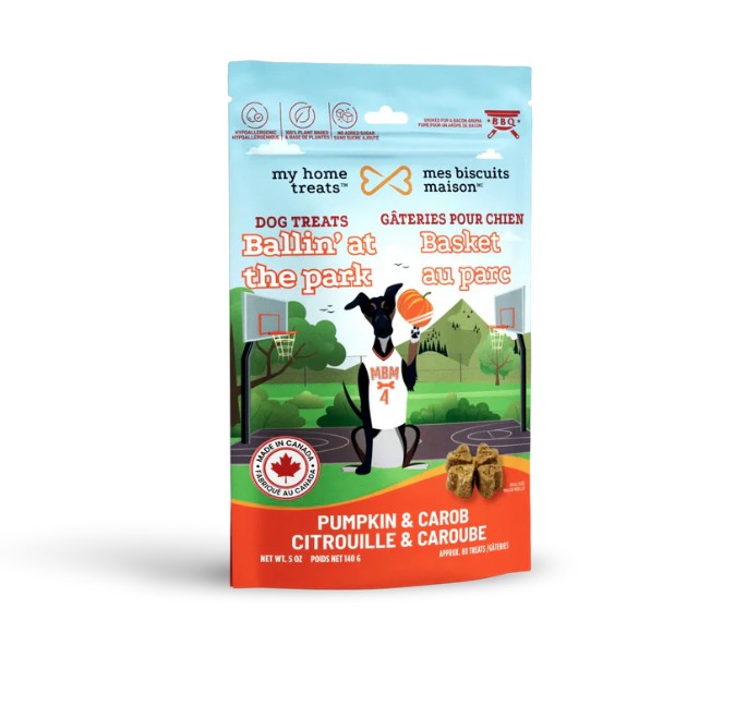 Sortez le ballon de basket du cabanon et allez jouer au parc avec votre chien! Voici une gâterie hypoallergénique pour chiens à la citrouille, avec du caroube et fumé au bois de cerisier! Une gâterie tarte à la citrouille pour chien!! Votre chien va dribbler avec des citrouilles après avoir gouté à l’une de ces gâteries!