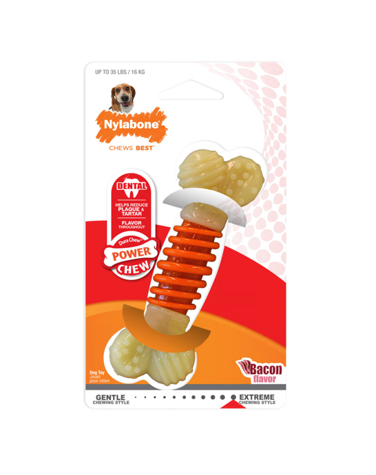Ce jouet à mâcher pour chien Nylabone Power Chew Pro Action offre à votre chien les soins dentaires et la satisfaction de mastication dont il a besoin pour rester en bonne santé et heureux. Ce jouet à mâcher au goût de bacon a des extrémités en nylon durables conçues pour une mastication puissante et des crêtes plus douces entre les deux, ce qui en fait un jouet à mâcher dentaire pour chien qui aide à rafraîchir l’haleine, à masser les gencives et à nettoyer les dents avec une triple action de nettoyage. Un jouet dentaire pour chien et un plaisir de mastication tout en un !