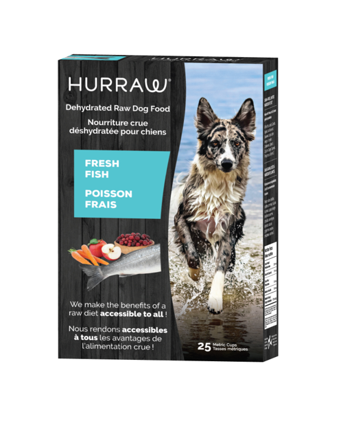 Cette nourriture sans grains de haute qualité qui contient des ingrédients de consommation humaine à 100%. Elle est doucement déshydratée à de basses températures afin d’y préserver toute la qualité contenue dans un ingrédient cru. Les chiens adorent Hurraw au Poisson grâce à son odeur qui est tout simplement irrésistible! Les poils de votre animal seront plus beaux en plus de régler ses troubles digestifs. Fini les taches de brulure sur la pelouse grâce à Hurraw! Aussi, vous resterez surpris de la taille des selles et la vitesse à laquelle celles-ci se décompose. Bref vous en ramasserez moins … moins souvent! De plus, la quantité de nourriture Hurraw au Poisson que vous devez donner à votre chien est minime!